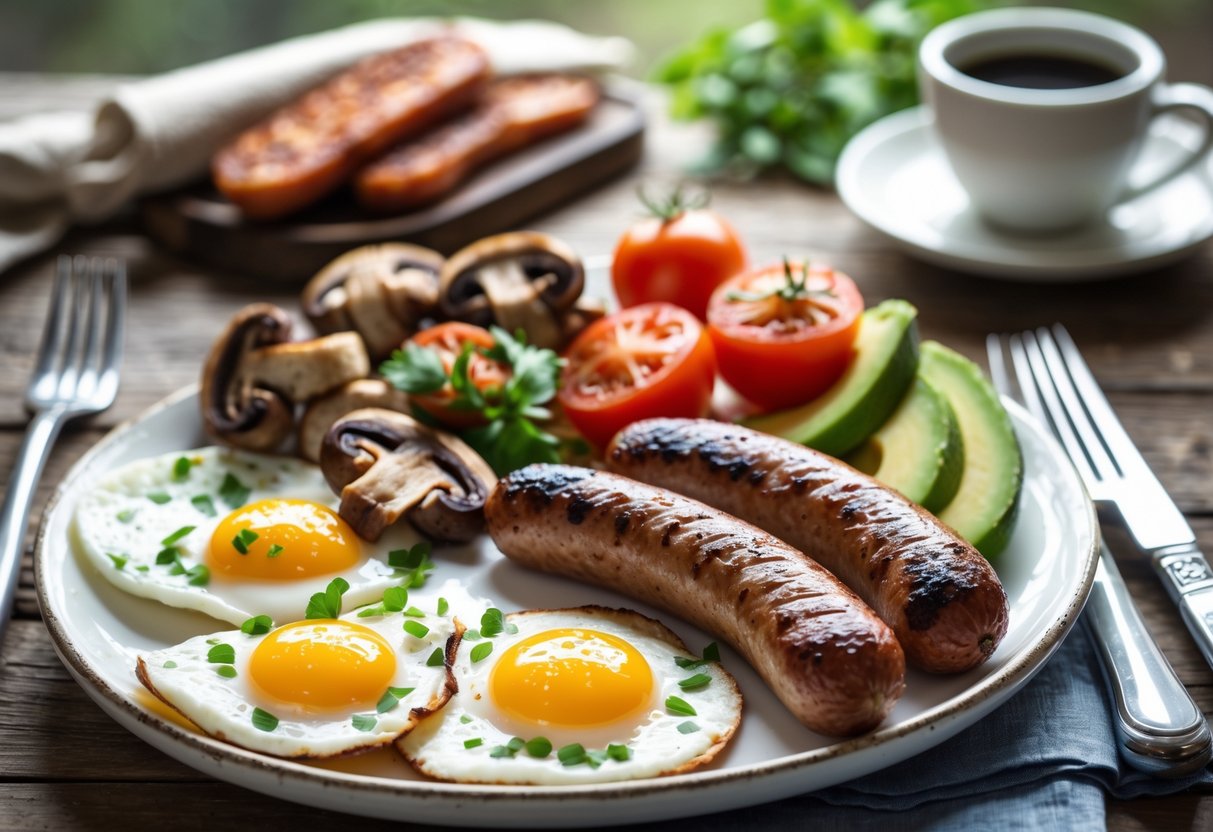 Keep an eye on protein—too much can kick you out of ketosis. Two eggs and two sausages usually hit the sweet spot.