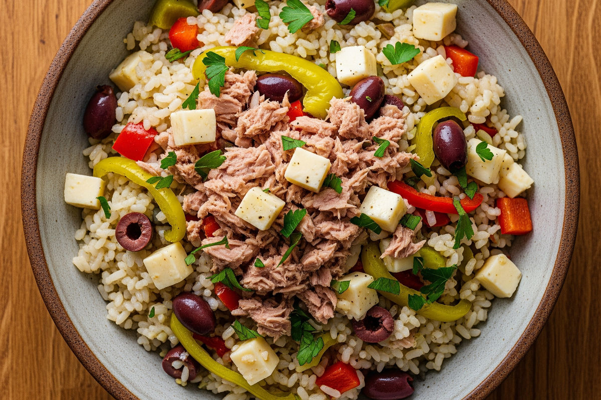 While the rice cools, prepare all your mix-ins. Drain 2 cans (160g total) of good-quality tuna packed in olive oil, reserving the oil. Dice 200g of firm mozzarella or provolone into 1cm cubes. Halve and pit 150g of mixed olives. Dice 1 large red bell pepper and 1 large yellow bell pepper, removing all seeds and white pith. Drain 100g of giardiniera and roughly chop if the pieces are large.